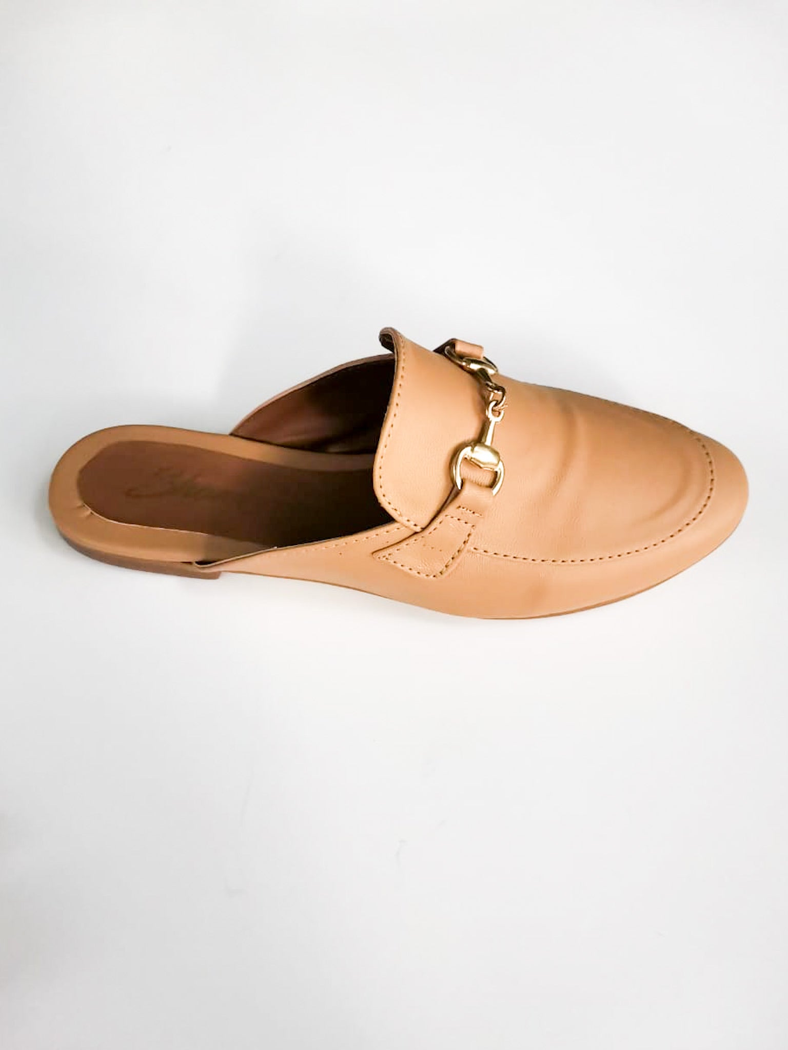 Mule de piso tipo loafer con herraje dorado de eslabones al frente.